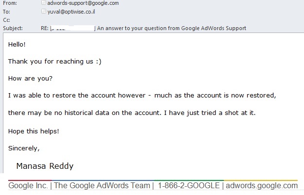 במקרה המדובר מייל התשובה הגיע כבר למחרת הפנייה ובמייל זה, למרות שהחשבון שוחזר על ידי גוגל הם אינם מתחייבים לכך שכל הנתונים ההסטוריים קיימים: